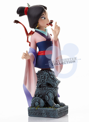 Colorful and lively Mushu is perched on Mulans shoulder in this charming Limited Edition 3,000 bust. The base is inspired by the Great Stone Dragon Mushu tries to awake at the familys temple to their ancestors.
