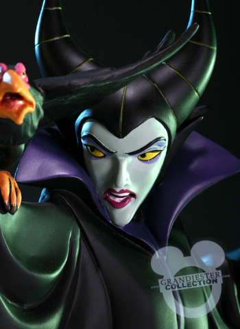Mixed-media Maleficent bust inspired by her appearance in Walt Disneys Sleeping Beauty animated film (1959), and released to celebrate its 50th Anniversary. This hand-painted polystone mini-bust features Maleficent and Diablo, her raven familiar, who is perched with spread wings upon Maleficents outstreched right arm.