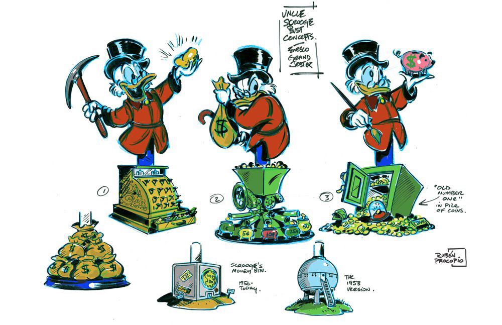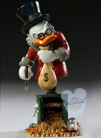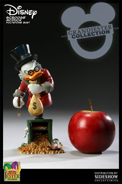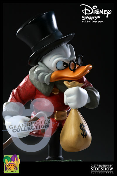 Scrooge McDuck loves money! Whether it is gold coins, silver bullion, or bundles of cash, the notorious skinflint is a duck obsessed. Now the tight-fisted tycoon is captured in all his fortune-hoarding glory in this character authentic, polystone mini-bust designed and sculpted by Disney animator Ruben Procopio, inspired by Scrooge's comic book adventures.