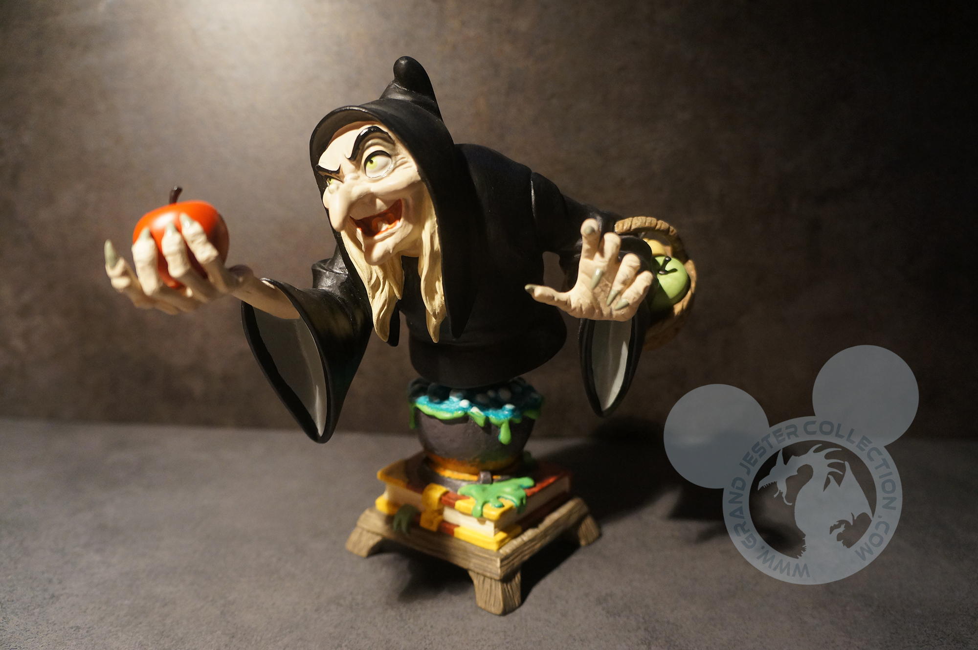 Behind the guise of a seemingly harmless crone, an evil queen plots the death of her innocent step-daughter, the lovely Snow White. This character authentic, polystone mini-bust designed and art directed by Disney animator / sculptor Ruben Procopio captures the poison apple-bearing Witch in all her twisted glory.